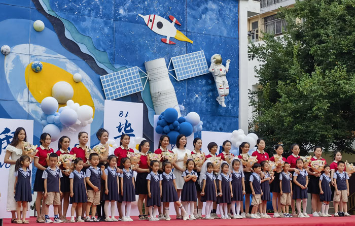 孩子们在老师的带领下走过成长门,走向绚烂美好的未来。