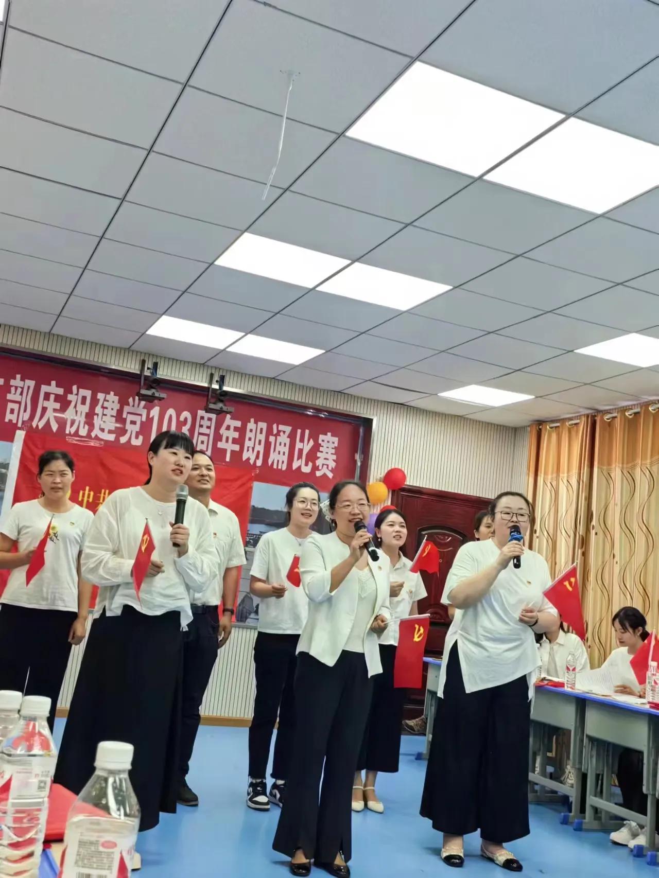 五个党小组积极准备,踊跃参加,每个党小组除朗诵节目之外,又自编自演了形式不同的节目,如手势舞、合唱、动画配音。整个活动内容丰富多彩,气氛热烈,党员教师们欢聚一堂,斗志昂扬,载歌载舞,庆祝这个光辉的节日,向伟大的中国共产党献上真挚的祝福。