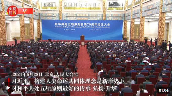 6月28日上午,和平共处五项原则发表70周年纪念大会在北京人民大会堂隆重举行。国家主席习近平出席纪念大会并发表题为《弘扬和平共处五项原则,携手构建人类命运共同体》的重要讲话。