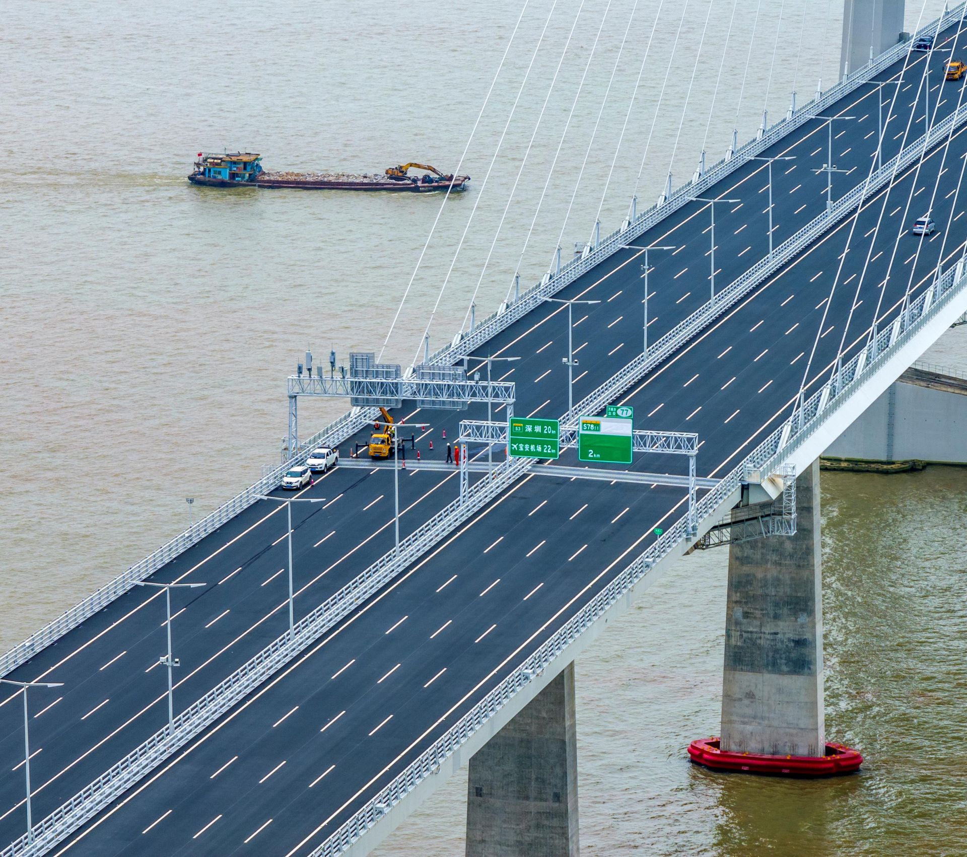 △2024年6月30日,深圳至中山跨江通道建成开通。这是通车前工人在做最后的检修和装饰。