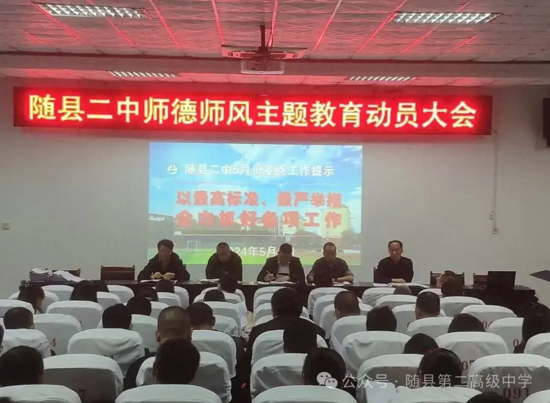 5月5日晚,学校召开师德师风主题教育动员会,高健主席领学《随县2024年教育系统师德师风建设主题教育活动方案》,宣读《随县二中2024年度师德师风建设主题教育活动方案》,聂世伟主席做动员报告。