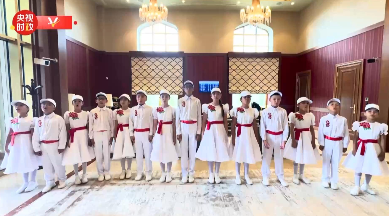 从北京到阿斯塔纳,千里之外的中亚上空响起熟悉的东方旋律。在迎宾仪式现场,十余名哈萨克斯坦少年儿童用中文演唱《歌唱祖国》。