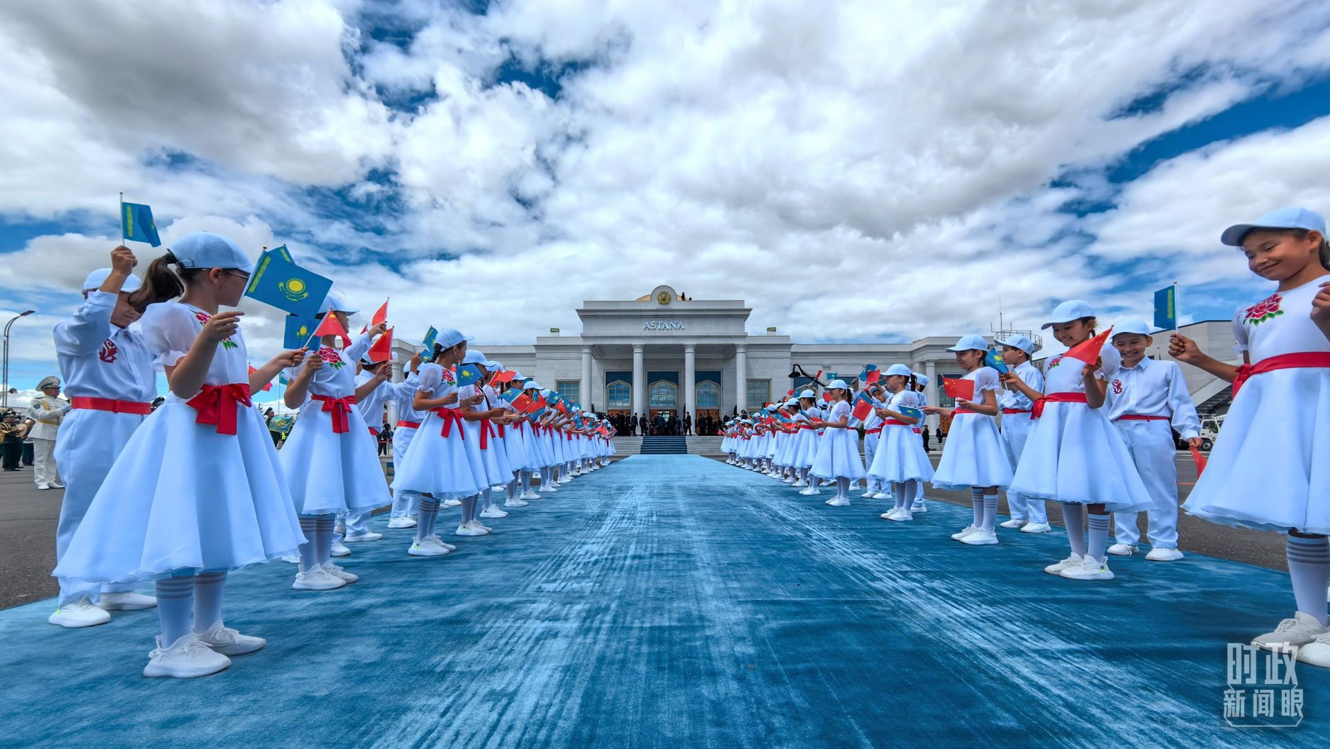仲夏的阿斯塔纳,生机盎然,辽阔壮美。停机坪上,天蓝色的地毯,热情的欢迎人群,传递着哈萨克斯坦对习主席的真诚相迎。