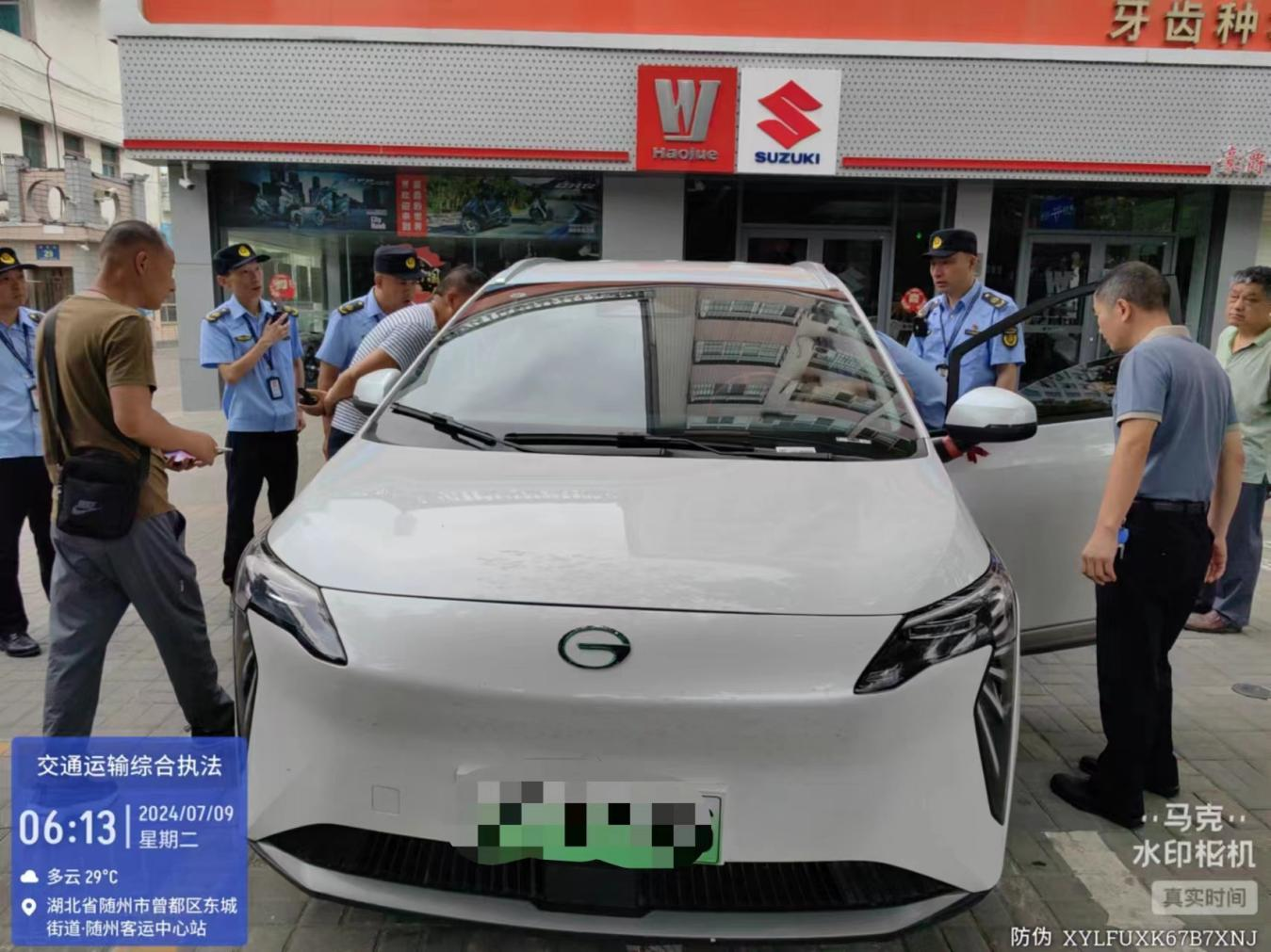 7月9日,随州市交通运输综合执法支队二大队与四大队共14名执法人员联合开展执法行动,对城区客运中心站周边客运市场秩序进行突击检查。6点左右,执法人员在开展巡查检查过程中,发现一名司机正在违规揽客,经执法人员上前询问了解,确认两名乘客与司机互相不认识,证实双方商议由客运中心站前往万和镇每名乘客以50元达成协议。通过现场核实、调查取证,该鄂SDXXXXX车辆涉嫌未取得巡游出租汽车经营许可,违规从事客运经营运输活动,目前对该车辆作依法暂扣,并将依法依规处理。