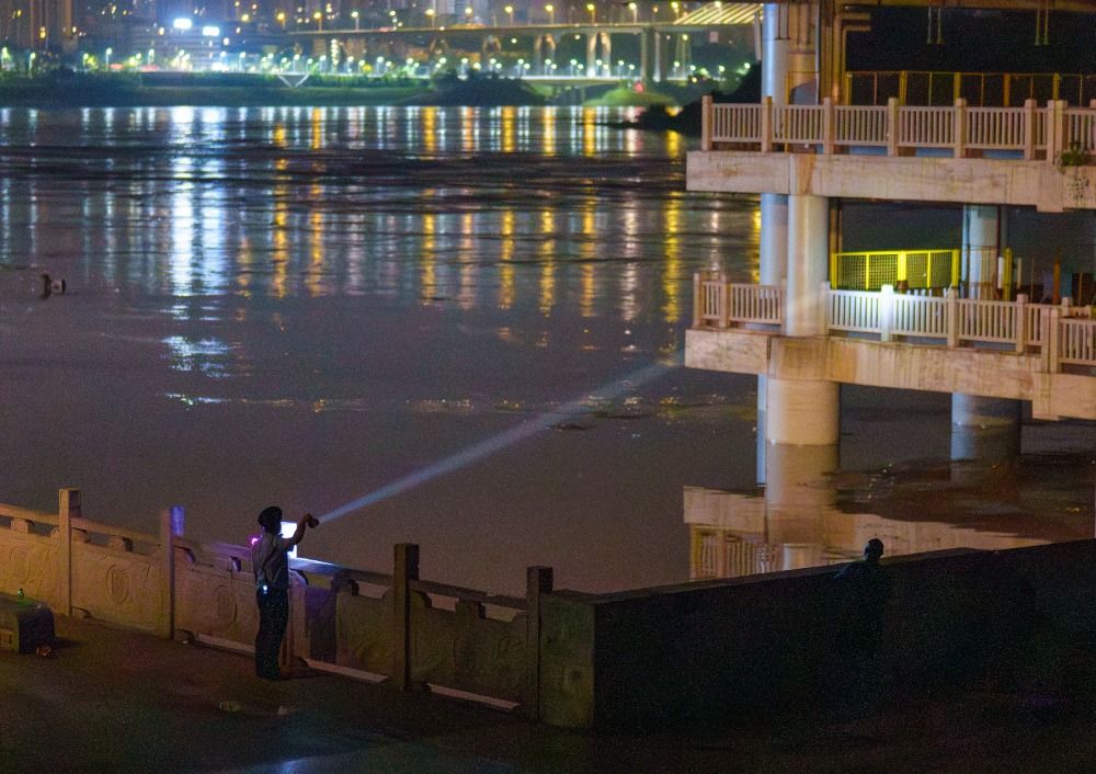 ▲7月12日凌晨,沙坪坝区磁器口码头,防汛值班员正在巡逻,确保没有市民在危险区域逗留。记者 李雨恒 摄