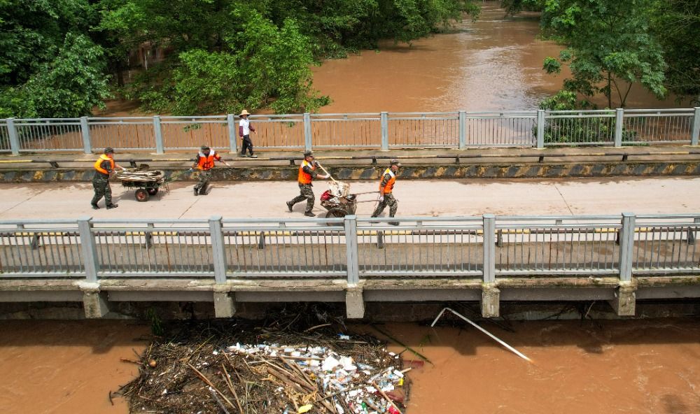 ▲7月12日,垫江县杠家镇龙凤社区,武警官兵们正在转运垃圾。通讯员 龚长浩 摄