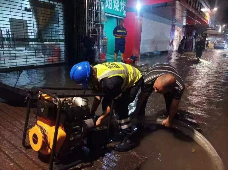 ▲7月14日0时,江津区,专业救援队正在组织开展排涝。江津宣传部供图