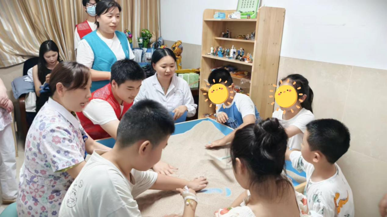 游戏是建立孩子友情的最好方式,在文帝院区心理沙盘活动室,精神心理科医护人员和来自儿科二病区的小患者们共同参与沙盘活动,孩子们的互动不断增加,欢声笑语此起彼伏,沙盘逐渐融洽和谐,友谊之花茁壮成长。在沙盘的世界,任何想法都是被允许的。在医护人员的引导下,一些较为腼腆的孩子被鼓励积极表达,他们从拘谨渐渐变得放松、活泼,在团体温暖的氛围中分享自己最本真的心愿。