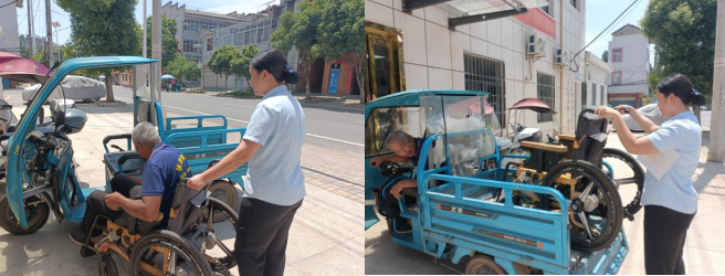 在察觉到老人求助后,综合窗口工作人员高小庆第一时间出门询问老人是否需要帮助。主动帮行动不便的老人将电动车后座的轮椅搬下,搀扶老人坐上轮椅,推入便民服务中心。