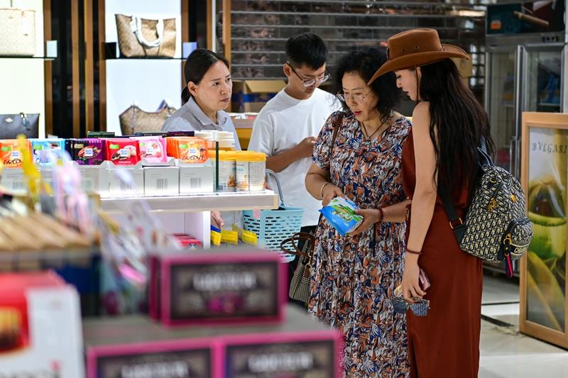△2024年7月26日,在中哈霍尔果斯国际边境合作中心,游客在免税店挑选商品。今年以来,新疆各大旅游目的地游客量持续攀升。