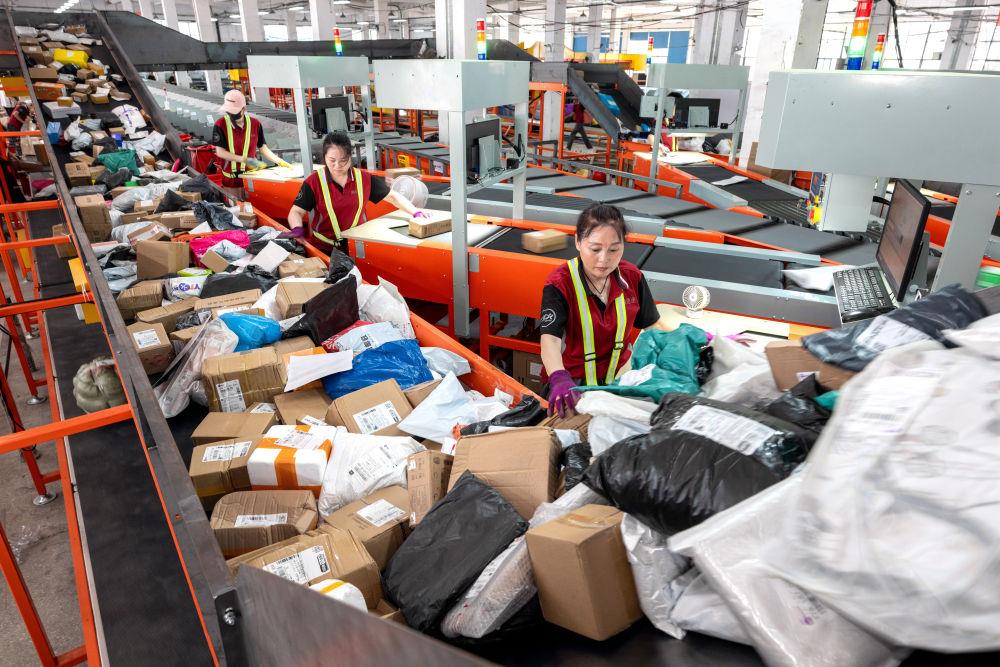 △截至6月30日,今年上半年我国快递业务量突破800亿件,比2023年提前59天。图为2024年6月18日,在浙江湖州市长兴县一家快递企业,工作人员忙着分拣、扫描出库等工作。