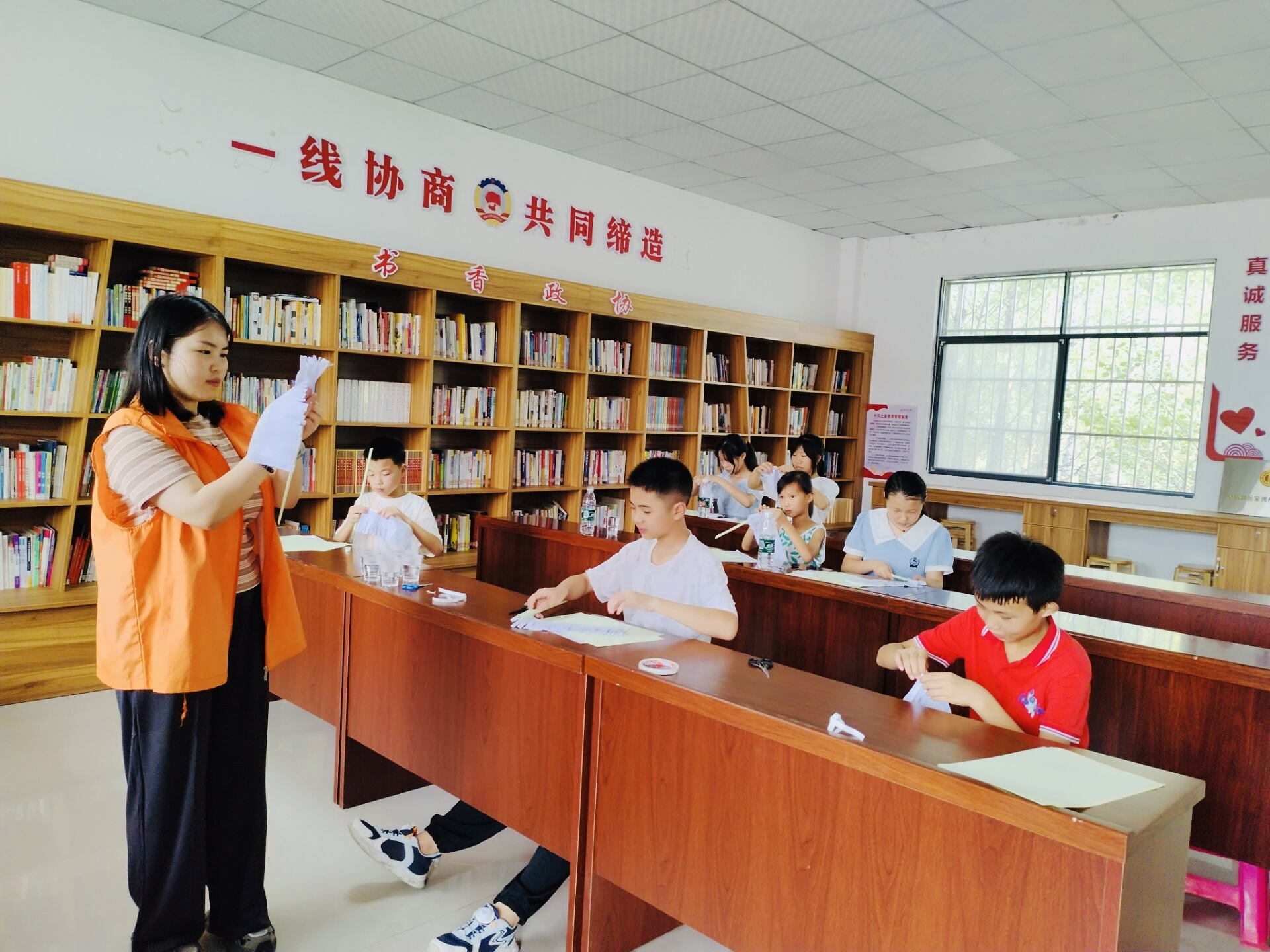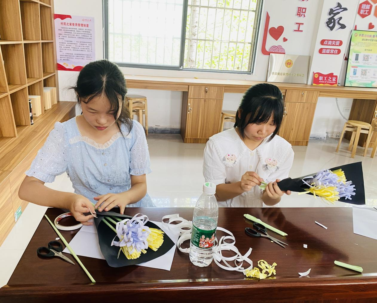 随后,社工给小朋友们发放剪刀、卡纸、双面胶等材料,手把手地指导他们制作手工菊花束,并在纸上写下想对逝去亲人说的话。剪纸、涂胶、卷枝干、叠花瓣……每个小朋友都做得非常投入,聚精会神,互帮互助,沉浸其中。制作出的每一朵“菊花”,都饱含着一份真情。“自己亲手做的花束,献给我的爷爷,虽然不太好看,但希望他能喜欢。”一位小朋友说道。