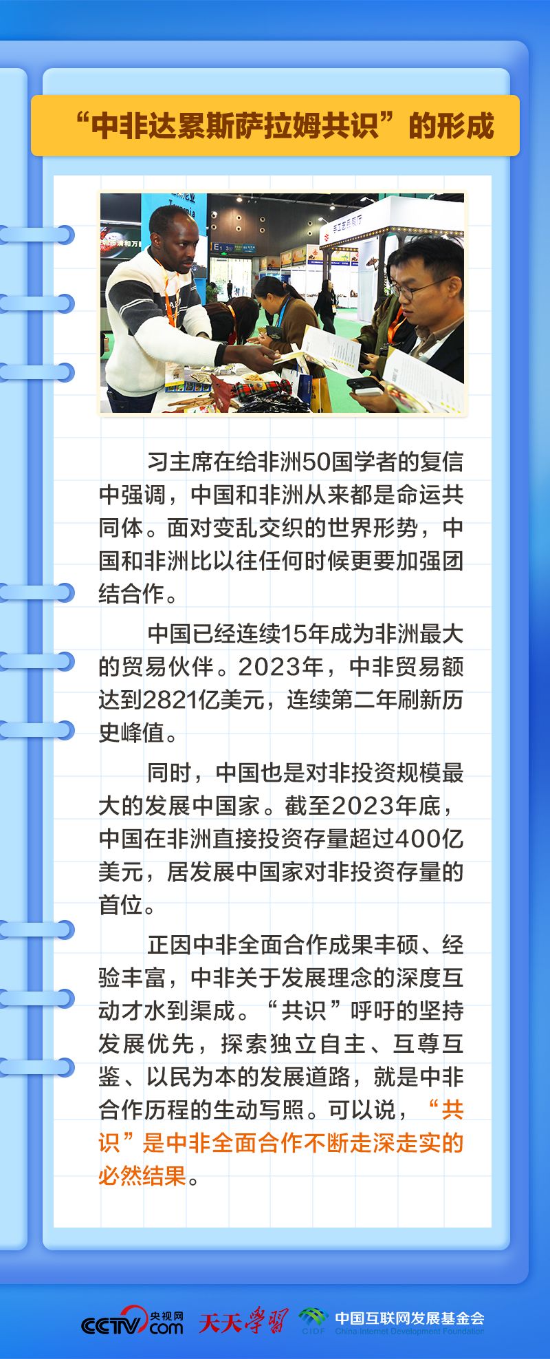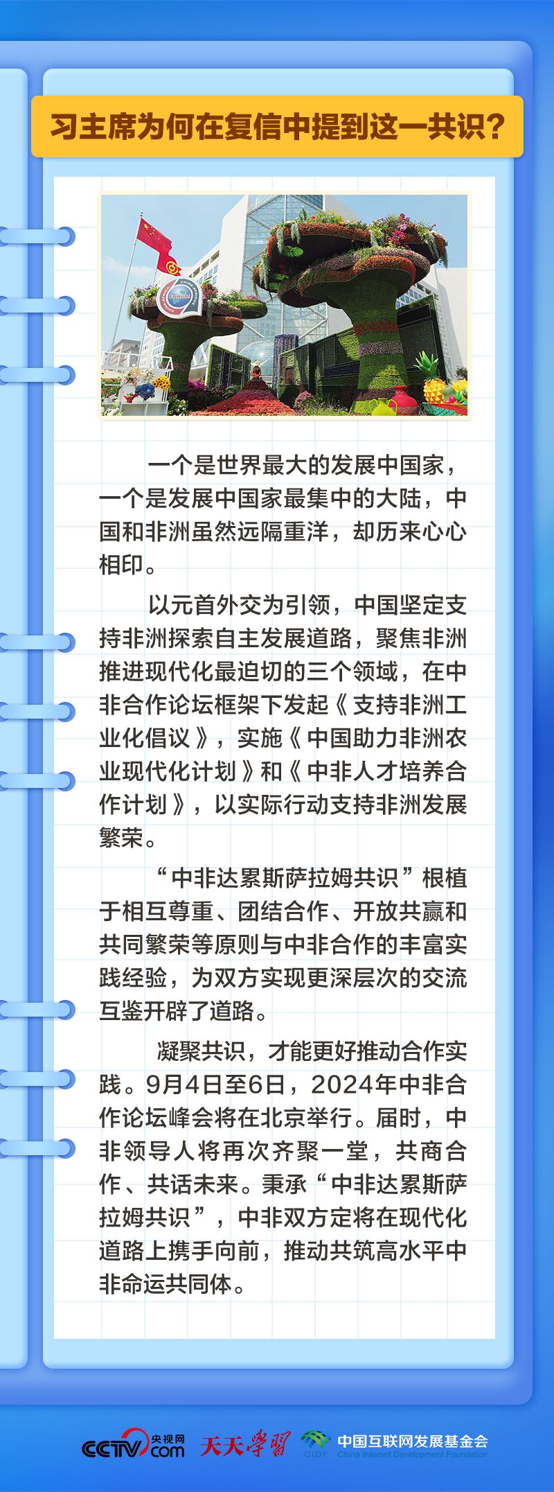 “中非达累斯萨拉姆共识”是在怎样的背景下形成的?这一共识的核心内容有哪些?习主席为何在复信中提到这一共识?央视网《天天学习》栏目推出学习笔记,与您一起学习、研读。