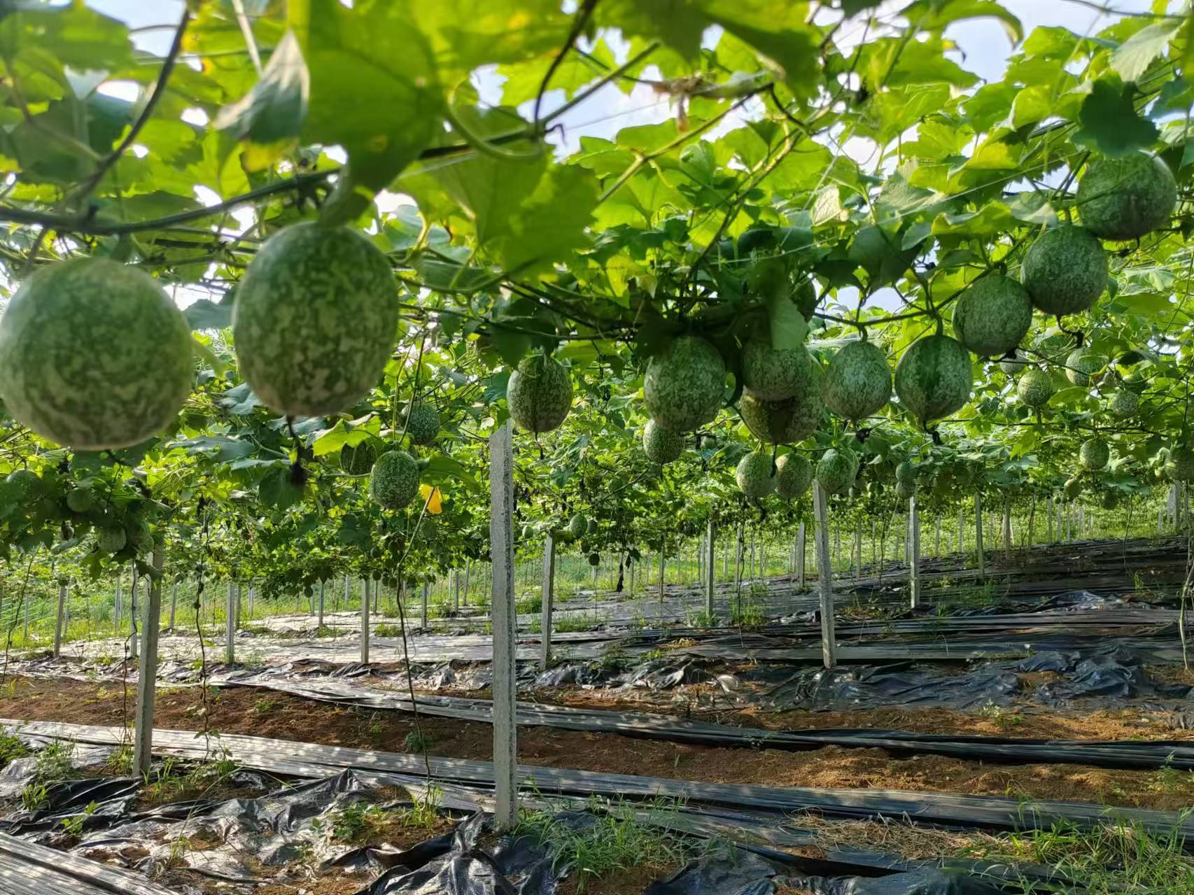 随州新闻网讯 (通讯员黄佳琪)9月,微风阵阵,余热未消。在澴潭镇二浪山村有这样一片种植基地,展现出热烈的丰收景象——所谓“垂垂山果挂青黄”,拨开青翠厚实的叶片,一个个沉甸甸、圆滚滚、拳头大小的果实挂满藤蔓,长势十分喜人。