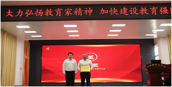 首先,小林镇党委组织委员张鹏同志宣读了市、县、镇级表彰文件。小林镇党委副书记、镇长徐少华同志为获奖单位、个人颁发了奖牌和荣誉证书。小林镇党委书记宫英堂为小林镇尊师重教企业家颁发了奖牌,他还代表党委镇府向中心学校捐赠了10台空调。