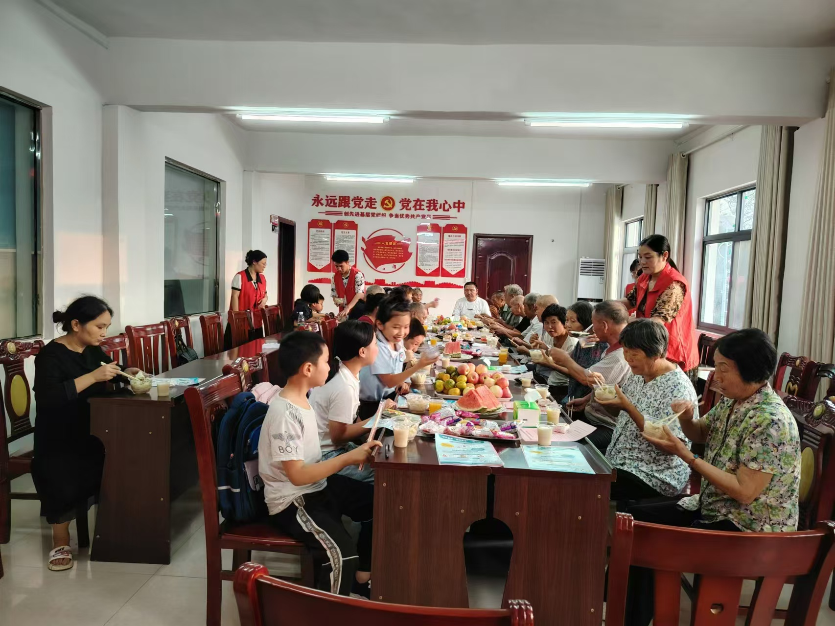 活动现场,志愿者们拿出提前采购好的各式月饼、水果、糕点摆在团圆桌上,大家吃着月饼话家常,现场其乐融融,弥漫着一派欢乐的气氛。