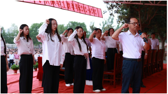 开学典礼在庄严的国歌声中拉开序幕,全体师生面向国旗肃然而立,怀着崇高的敬意注视着冉冉升起的国旗,心中燃起对新学期的美好憧憬。随后,7位新入职教师在校党委书记吴波带领下,和全体教职工在国旗下庄严宣誓,铮铮誓言体现了教师们对教育事业的忠诚与热爱,以及肩负起培育祖国未来栋梁的使命与担当!