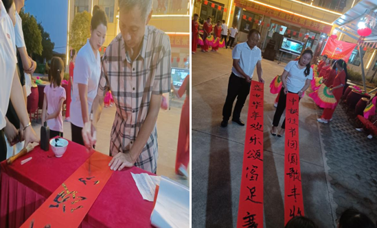 接下来,社区合唱队表演了大合唱《明天会更好》,他们用极富感染力的歌声唱出了万千情思,一下子点燃了现场观众的热情,大家纷纷跟唱。这首歌也奠定了整场活动的主题基调。晚会节目精彩纷呈,整场文艺演出均由演出团队自编、自导、自演,形式多样、精彩纷呈,有广场舞《毛主席的话记心上》和《情缘傈僳寨》、民间玩船《花蝴蝶》、歌曲《月亮代表我的心》、《父亲》、诗歌朗诵等节目,退休党员干部廖志海为中秋庆丰收献上墨宝,在一横一竖中让人领悟到了汉字之美,让更多人近距离感受书法的魅力,激发大家对中华优秀传统文化的热爱。