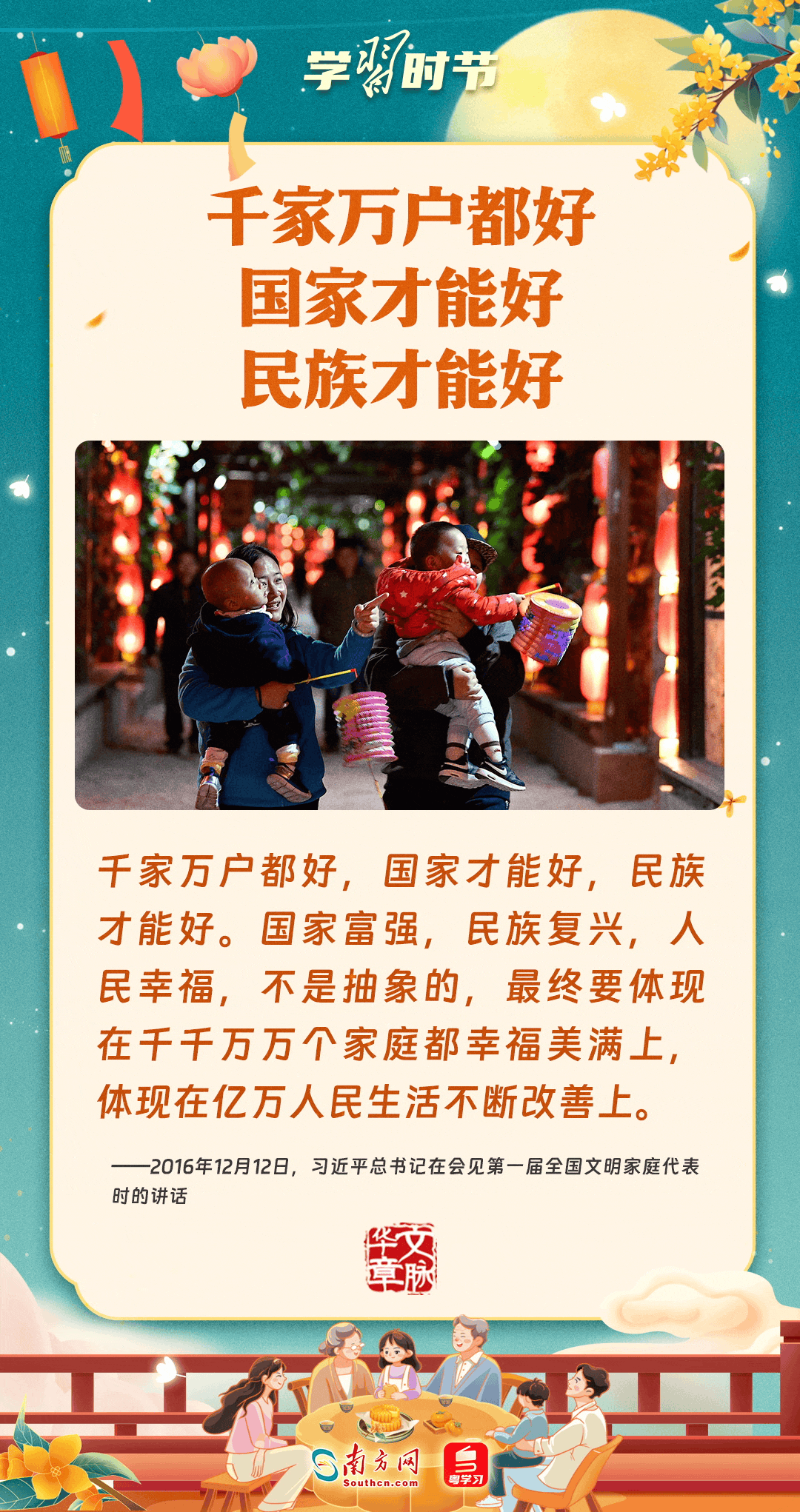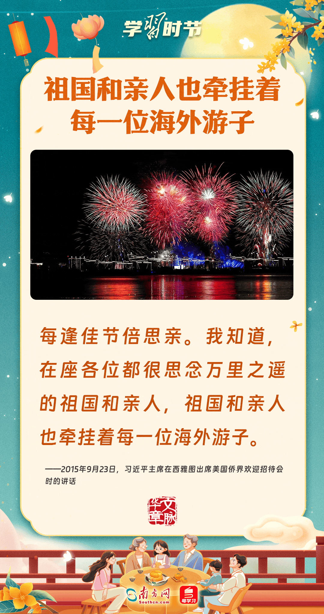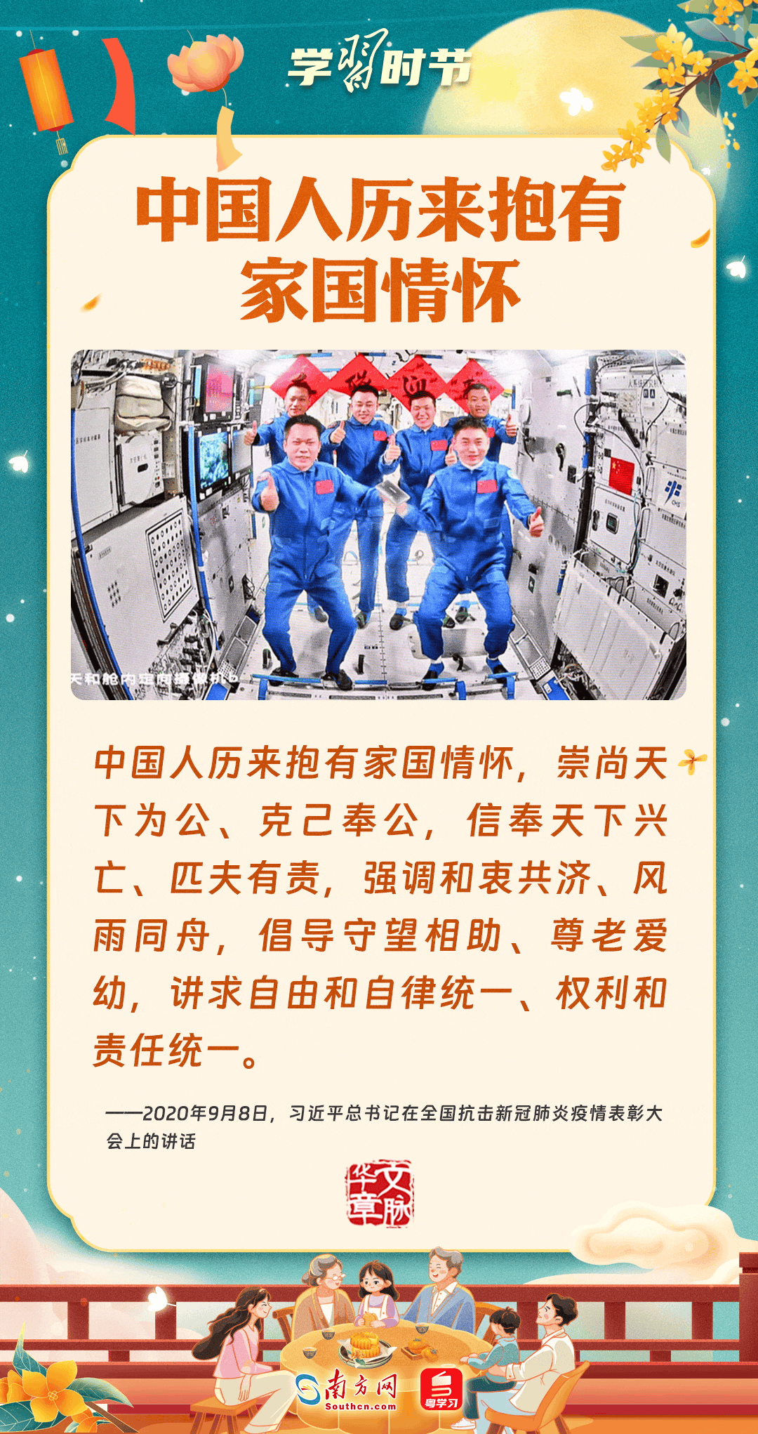 明月寄相思,家国总关情。作为中华优秀传统文化的重要载体之一,中秋节不但寄托着海内外华人对阖家团圆的美好期许,还承载着深厚的故乡情、家国情。习近平总书记曾在多个场合深刻阐述个人、家庭与国家之间的关系,强调要厚植家国情怀,把实现个人梦、家庭梦融入国家梦、民族梦之中。中秋佳节,让我们一起回顾总书记那些经典话语,共同感受他至深至厚的家国情怀。