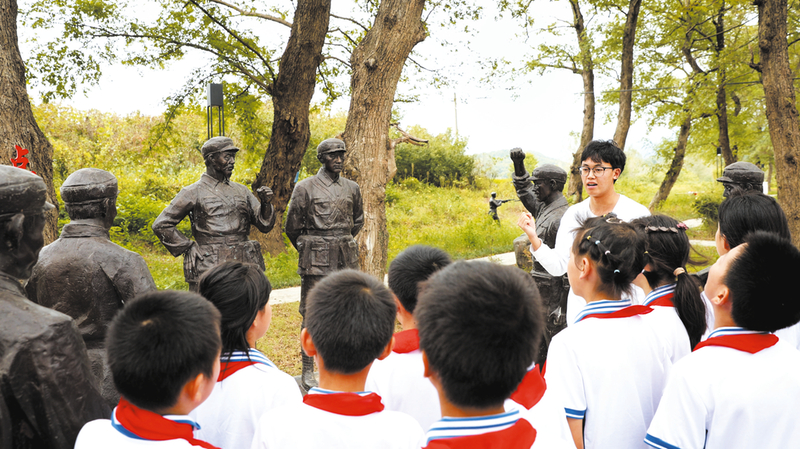小学生在吴店镇浆溪店村英雄林广场,听老师讲新四军第五师的战斗故事。 (随州日报全媒记者徐斌摄)