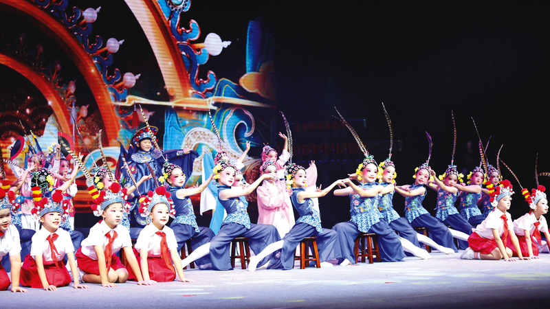 来自全市各县市区的10余所学校的师生在舞台上表演了器乐合奏、合唱、戏曲舞蹈、话剧、诗朗诵、音乐剧等节目,充分展示了我市学校美育教育成果。图为曾都区实验小学表演的戏曲舞蹈《国粹绽新芽》。 (随州日报全媒记者钟金辉摄)
