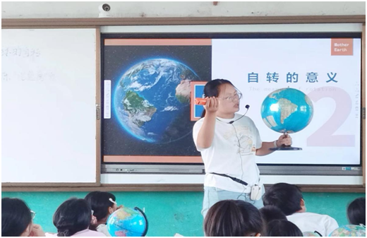 冉江艳老师执教的是七年级地理《地球的自转》。冉老师通过对课堂的精心设计,以饱满的情绪呈现了一节朴素高效的课堂。在课堂中,冉老师通过合理的情境设计,图文解析和实际观察等方式,生动有趣地向学生展示了地球自转的过程和对日夜变化、地区时间的影响,充分激发了学生的好奇心和想象力。