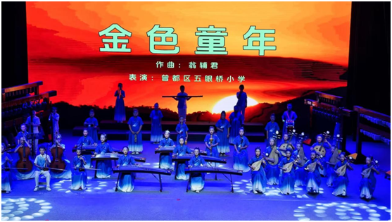 曾都区五眼桥小学原创器乐合奏《金色童年》开场演奏,震撼全场,充分展示了五小学子的艺术风采和积极昂扬的精神风貌。《金色童年》积极向上,富有青少年朝气,具有鲜明的时代特征,在2024年随州市第三届“非遗”展演中首次亮相,即斩获金奖。《金色童年》将代表随州市参加湖北省第十三届黄鹤美育节。
