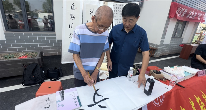 村民程荣锋是书法爱好者,在书法展摊位前,曾都区书法主席邹勇正手把手教他练字。程荣锋写起了“文明”二字,最后两人还合影留了个纪念。邹勇说:“我们书法协会经常参加公益集市摆摊,免费教书法爱好者写字,通过这种方式让中国文化传承发扬下去。”