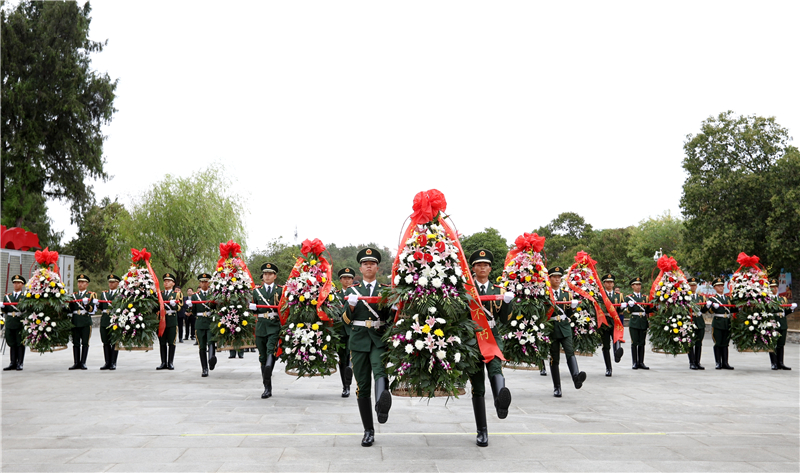 随着《献花曲》旋律响起,礼兵抬起花篮,正步向前,向烈士纪念碑敬献花篮,将后人的哀思和敬意敬献给长眠于此的英雄先烈。