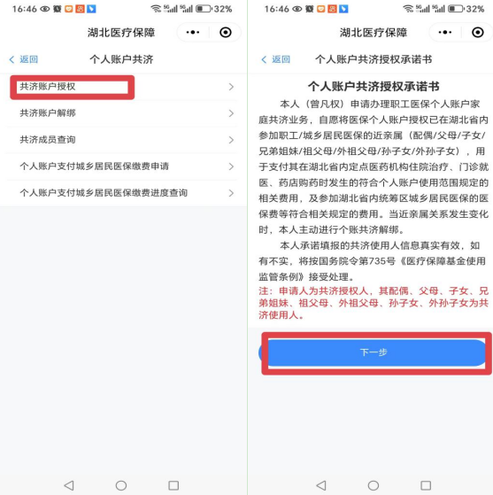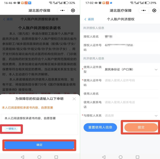 点击“共济账户授权”、“下一步”、“一键输入”、“确定”,按照要求填写相关信息,点击“提交”即可完成共济账户授权。