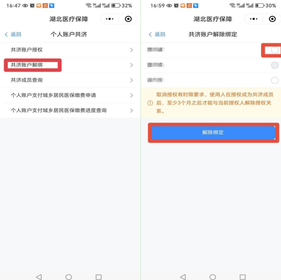 在个人共济界面点击“共济账户解绑”,选择选择确认要解绑的成员点击“解除绑定”。