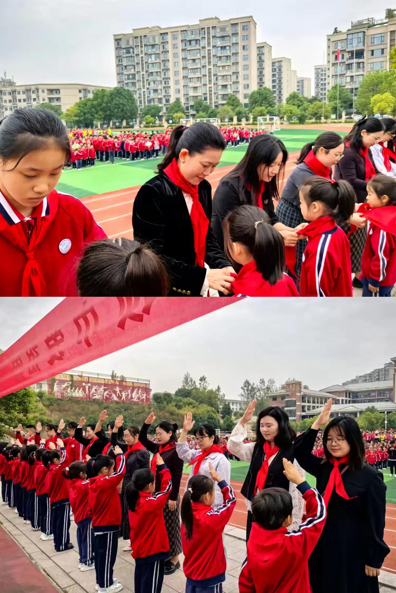 星星火炬,代代相传,红旗一角,鲜艳荣光。大队长梅紫裕宣读新队员名单,二年级568名预备队员被正式批准加入中国少年先锋队。红领巾是骄傲、是传承、是希望。团区委书记戴露、白云湖小学教联体各学校负责少先队工作的有关同志、以及白云湖小学老队员代表为新队员佩戴红领巾,他们互敬队礼,荣耀传递。这是红色基因传承的神圣时刻。这一刻,不仅是红领巾的传递,更是信念与责任的传承。