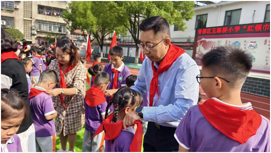 在激昂的出旗曲中,大队旗由三名旗手护送入场,仪式正式开始。本次入队仪式上共有175名队员经过队前考核,由学校少工委批准加入中国少年先锋队。大队长宣读新队员名单,学校领导、中队辅导员和老队员为新队员佩戴红领巾。那一刻,新队员们的脸上洋溢着激动与自豪的笑容,他们深知,这不仅仅是一条红领巾的传递,更是革命精神的薪火传承和时代责任的接力。