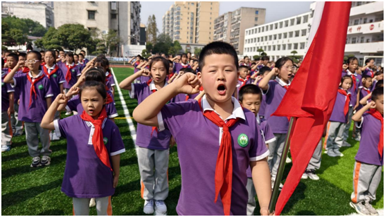 随后,全体少先队员在队旗下庄严宣誓,铿锵有力的誓言回荡在操场上空,表达了他们热爱祖国、热爱人民、热爱中国共产党的坚定信念和决心。誓言声中,不仅有对过去的铭记,更有对未来的憧憬和承诺。
