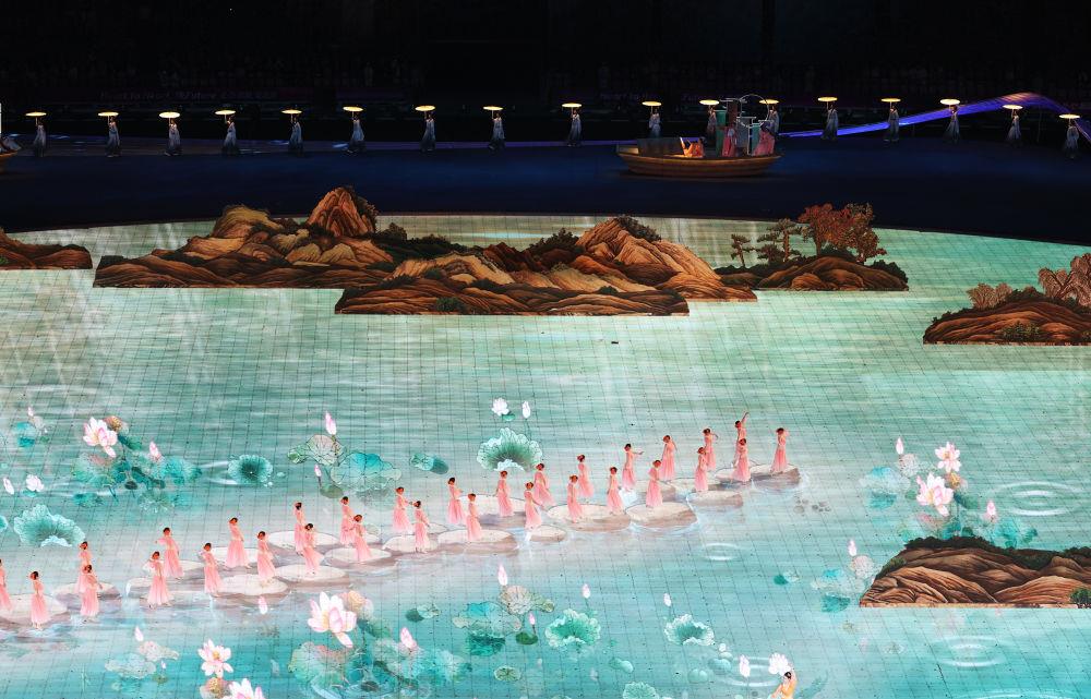 △2023年9月23日,演员在杭州亚运会开幕式上表演。《千里江山图》和《富春山居图》两幅国宝级名画,通过数字技术,成为移动的山水。