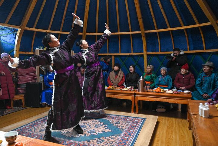 △2023年12月21日,乌兰牧骑队员在内蒙古阿其图乌拉苏木进行舞蹈表演。