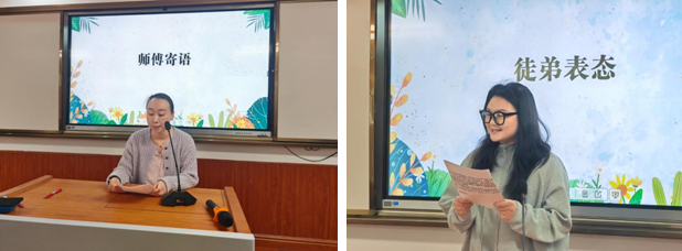 会上,师徒双方分别进行了发言。张泉老师承诺:作为师傅,一定会以身作则,做徒弟的榜样,努力创造一切条件帮助徒弟成长,毫无保留地指导徒弟,和徒弟共同成长。黄羽老师表态——一定会虚心向师傅学习、请教。