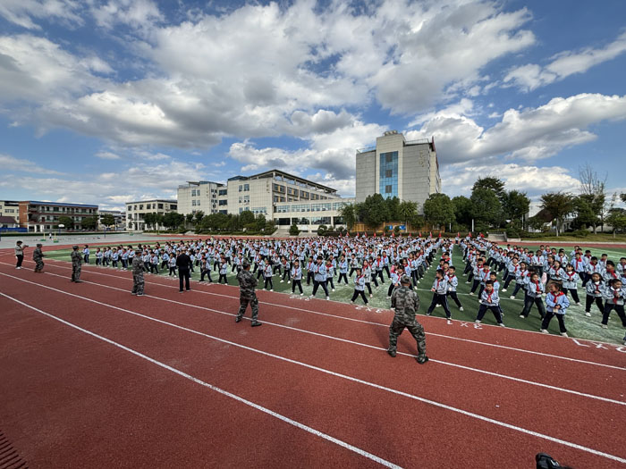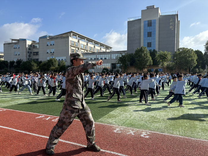 同学们认真训练,教官教授站军姿、齐步走、正步、行礼,规范学生的行走坐卧等行为习惯。教官们示范教学军体拳,动作刚劲有力,学生在学习过程中感受到军人的勇敢和无畏,激扬斗志,不断超越自我。