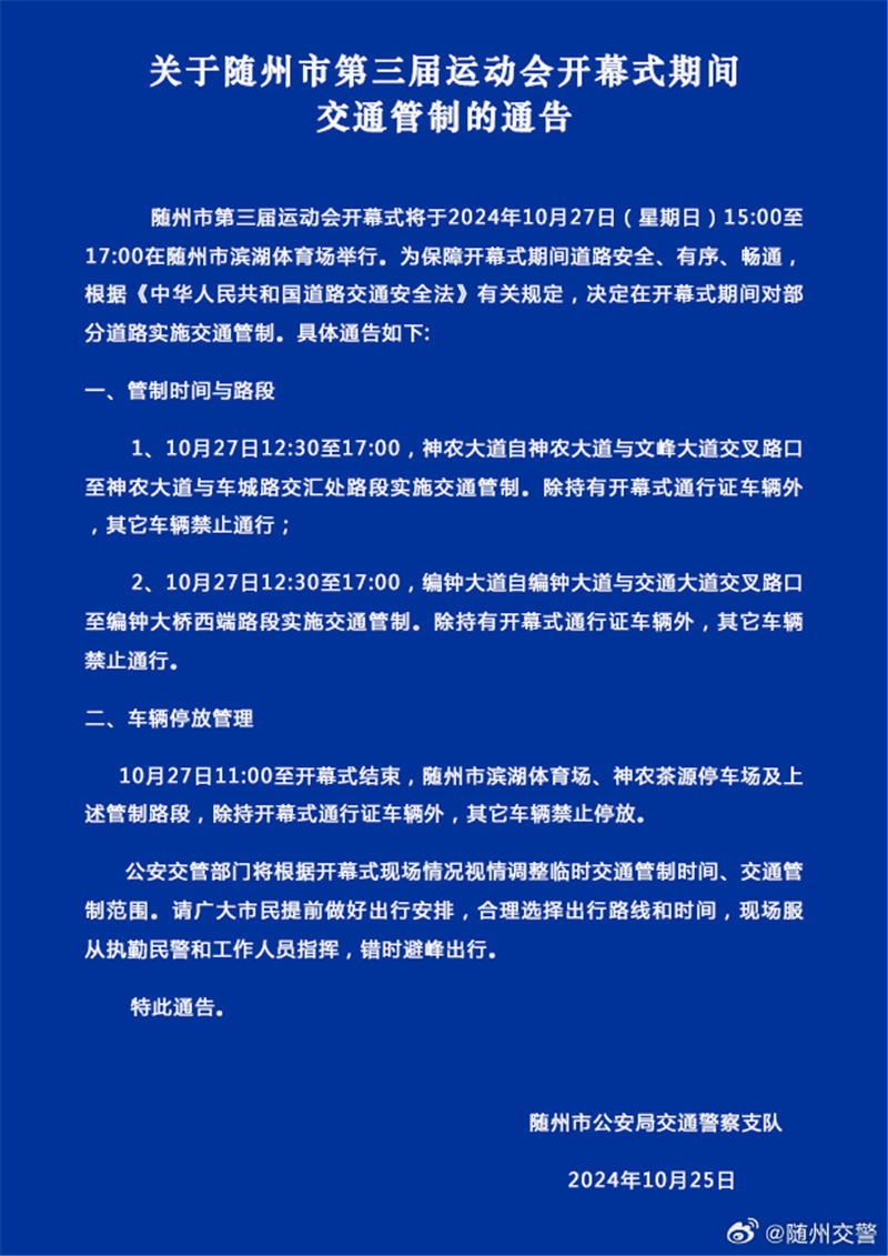 关于随州市第三届运动会开幕式期间交通管制的通告