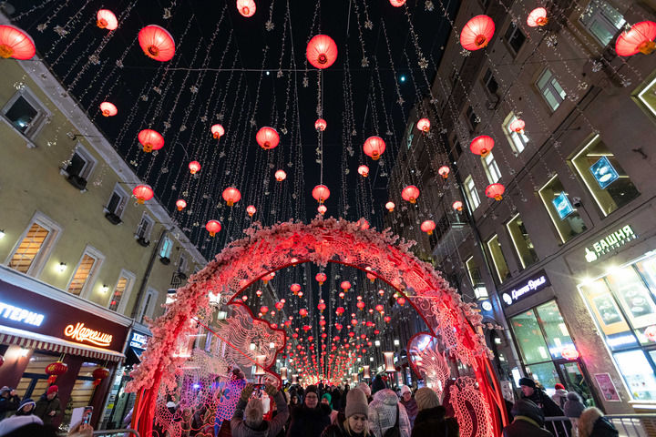 这是2024年2月9日在俄罗斯首都莫斯科拍摄的挂满中国新年主题装饰的街道。新华社记者 白雪骐 摄