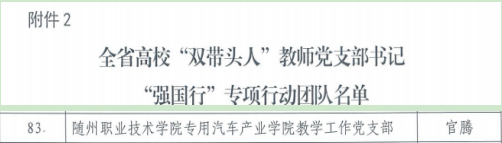随州新闻网讯 (通讯员 陈达)近日,中共湖北省委教育工委公布了全省高校“双带头人”教师党支部书记“强国行”专项行动团队名单,随州职业技术学院专用汽车产业学院教工党支部入选。