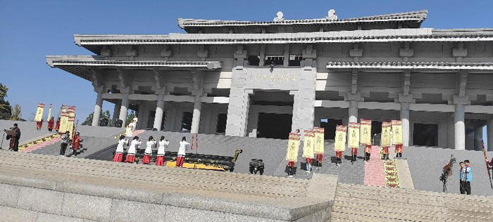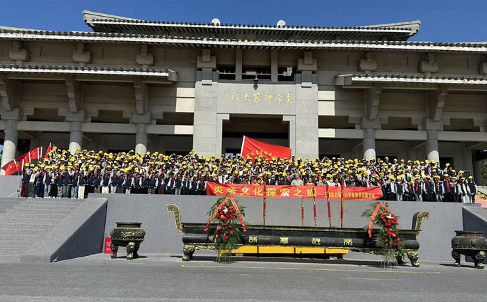 在基地导师的带领下,全体师生步行至圣象广场举行开营仪式,途径文化雕塑壁,照壁,四牛耕作石雕,华夏始祖门,圣火台,炎帝圣像等,并在圣像广场进行学生版的“拜祖大典”。