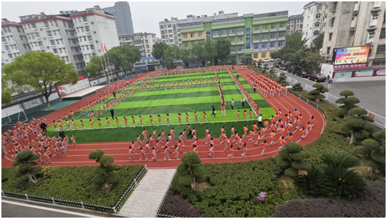跑操环节,全体师生迈着整齐的步伐,口号响亮,铿锵有力。跑操形式新颖,是本次展示活动的最大亮点。外圈沿着椭圆形跑道逆时针慢跑,中圈沿着长方形足球场顺时针慢跑,内圈两个班分别沿两个正方形半场顺时针、逆时针慢跑,整个场面十分令人震撼。
