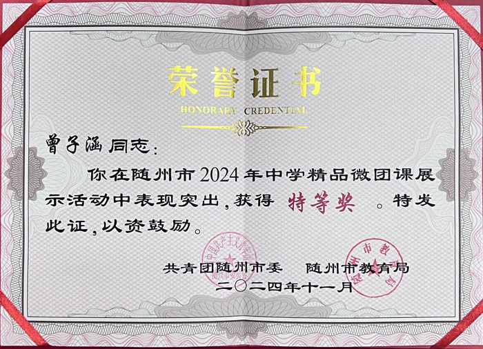)11月5号下午,由共青团随州市委、随州市教育局联合举办的随州市2024年“青春为中国式现代化湖北实践挺膺担当”中学精品微团课比赛活动顺利举行,曾都区实验初级中学团委副书记曾子涵荣获特等奖,将推送参加省赛!