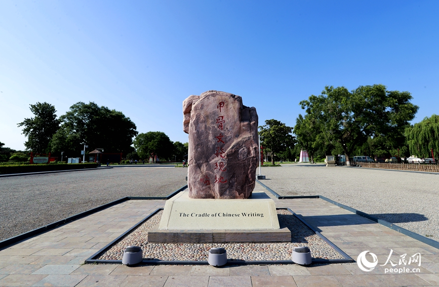 安阳是甲骨文的故乡,图为殷墟宗庙宫殿遗址景区的石碑。人民网记者 慎志远摄