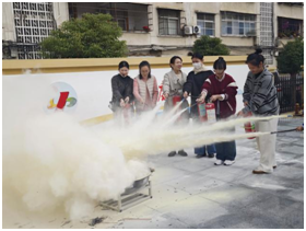 分管安全的副校长唐政为大家示范并讲解了灭火器的使用方法与操作技巧,学校的食堂工作人员、教师代表、学生代表们纷纷拿起灭火器,进行灭火的实战演练。