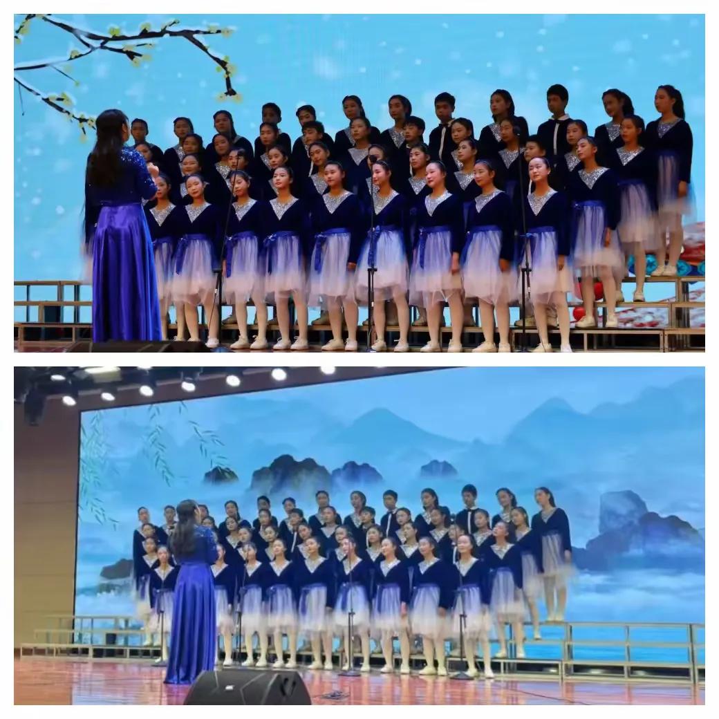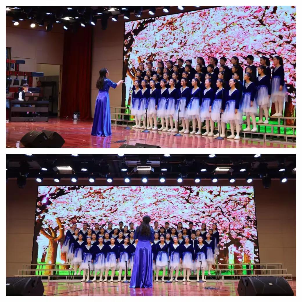 合唱开始,队员们身着统一的蓝色演出服,面带微笑,身体随着指挥老师的手微微摆动,像一阵阵少年的风……《长大之前》这首歌开篇引用五代李煜的《相见欢·林花谢了春红》经典词句,展现了当代少年昂扬向上、乐观自信的精神面貌。