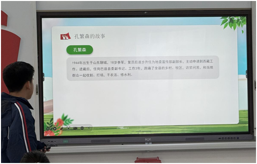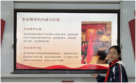 七年级五班的王可儿同学以“红色历史故事,弘扬革命精神——伴随学生成长,争做合格接班人”为主题,带来了精彩的分享。她首先生动阐述了红色革命精神的内涵,接着通过狼牙山五壮士的英勇事迹倡导大家弘扬革命精神,树立远大理想;培养爱国情怀,增强民族自豪感;践行社会主义核心价值观,做新时代的好少年。最后,她分享了自己从红色故事中得到的启示,并表示将把这些启示融入日常学习,努力传承和发扬革命精神。