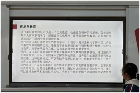 七年级七班的甄可馨、李怡然同学就江汉军区革命旧址和发生在此的英雄事迹进行了深刻的分享。她们指出,江汉军区作为一处重要的红色精神传承地,对于教育意义重大。这里不仅是解放战争时期江汉军区司令部的所在地,而且承载了丰富的革命历史和英雄事迹。通过她们的分享,学生们可以更直观地了解到70多年前江汉军区司令部在这里运筹帷幄,指挥大江汉地区的军事斗争,为红旗漫卷荆楚大地作出了不可磨灭的贡献。这样的历史背景和英雄事迹,不仅让学生们学习到了革命精神,也启发他们要传承这种精神,将其融入到日常学习和生活中,培养坚韧不拔、勇于奋斗的品格。