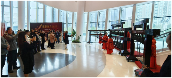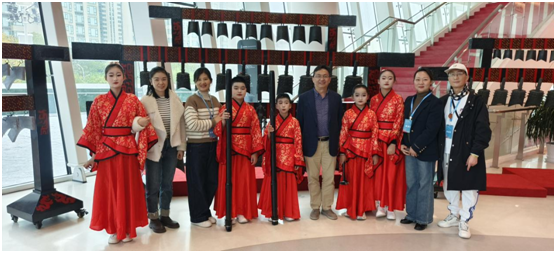 迎宾大厅,纯净悦耳的编钟声传来,余音袅袅。一曲由编钟编磬合奏的《东方红》喷薄而出,旋律悠扬,清脆洪亮,将浑厚庄重与深沉柔美完美地演绎出来,与会嘉宾被美妙的音乐所吸引,更被小小演奏者精湛的技艺所震惊,纷纷驻足观赏,陶醉其中,赞叹声不绝于耳。一曲终了,现场爆发出雷鸣般的掌声,与会领导纷纷上前与小小演奏者合影。
